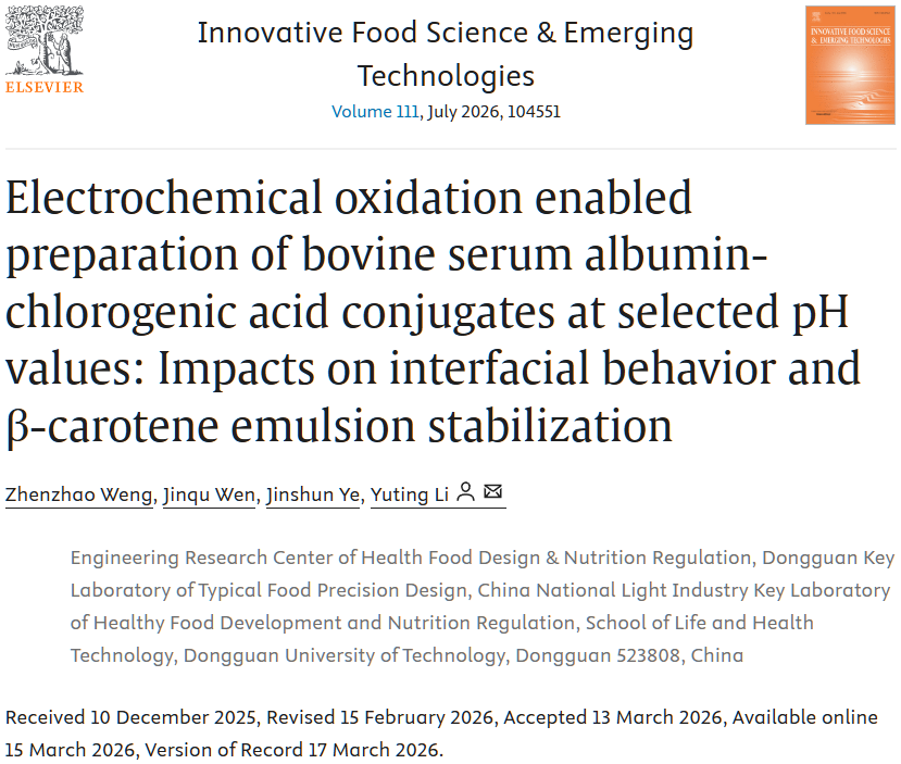 2026年3月,公司硕士研究生翁振钊以第一作者身份于国际食品顶级期刊《Innovative Food Science & Emerging Technologies》(IF:6.8)发表题为“Electrochemical oxidation enabled preparation of bovine serum albumin-chlorogenic acid conjugates at selected pH values: Impacts on interfacial behavior and β-carotene emulsion stabilization”的研究性文章。公司李玉婷特聘教授为该论文通讯作者。本研究采用电化学氧...