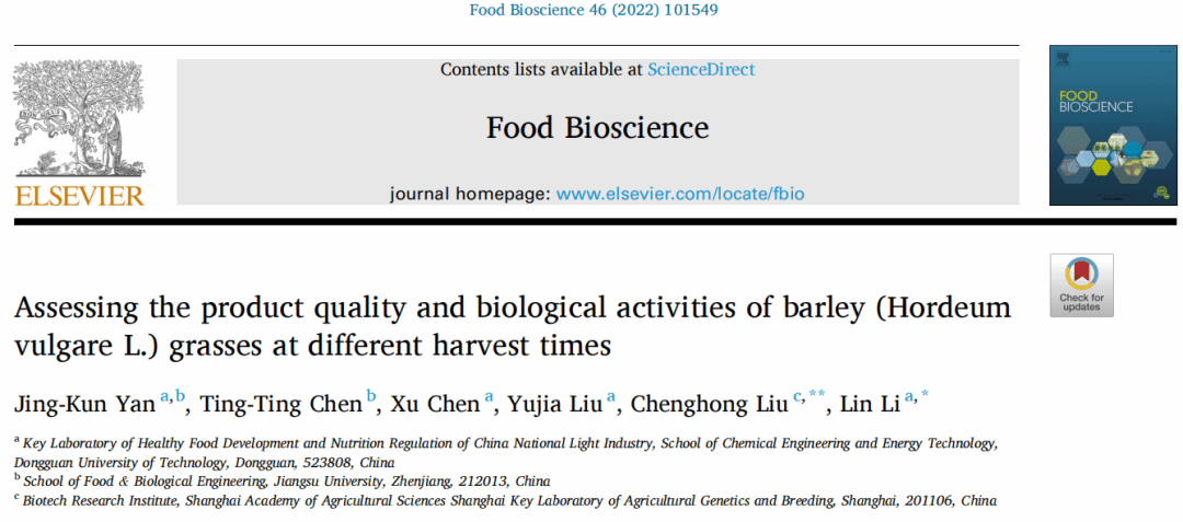 2022年3月,韦德官方网站食品营养健康工程与智能化加工研究中心闫景坤教授(第一作者)在国际食品期刊《Food Bioscience》(IF: 5.318, 中科院二区)发表了题为“Assessing the product quality and biological activities of barley (Hordeum vulgare L.) grasses at different harvest times”的研究论文。