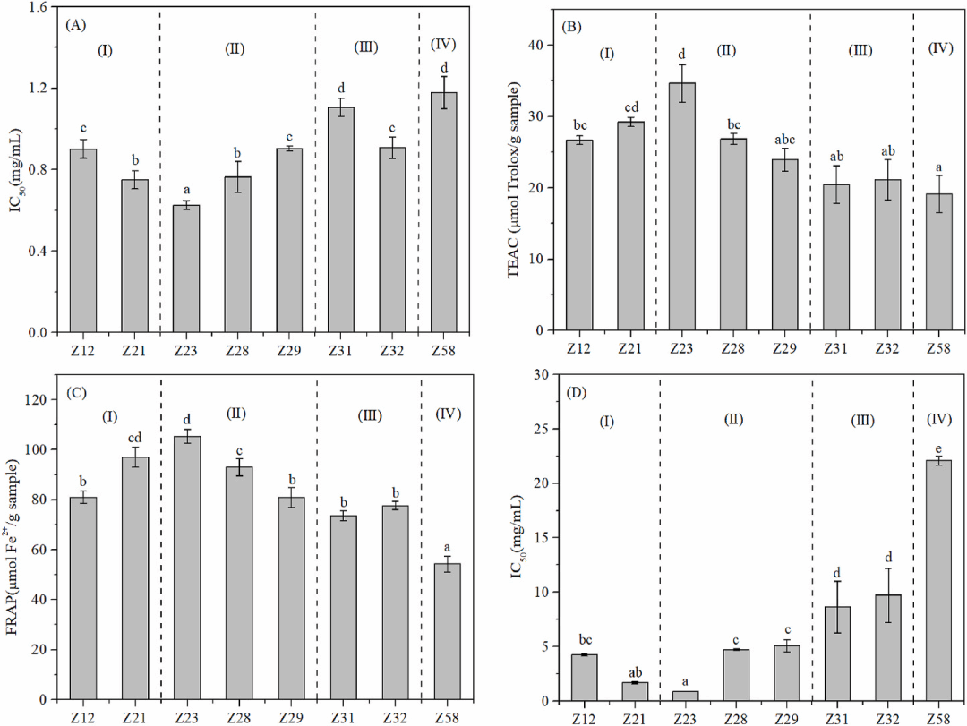 图3 不同生长期大麦苗的DPPH自由基清除活性(A)、总抗氧化能力(B)、铁离子还原能力(C)和α-葡萄糖苷酶抑制活性(D)