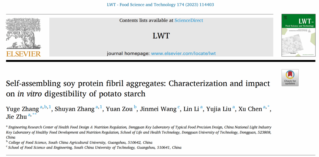 本研究以《Self-assembling soy protein fibril aggregates: Characterization and impact on in vitro digestibility of potato starch》为题发表在SCI收录期刊《LWT-Food Science and Technology》(IF: 6.056, Q1)。韦德官方网站-华南农业大学联合培养在读硕士张昱格为本文第一作者,bevictor韦德国际实验员张书艳为共同一作,陈旭博士和朱杰副教授为通讯作者。该论文是公司bevictor韦德国际与联合高校共同培养硕士研究生积累的又一新成果。