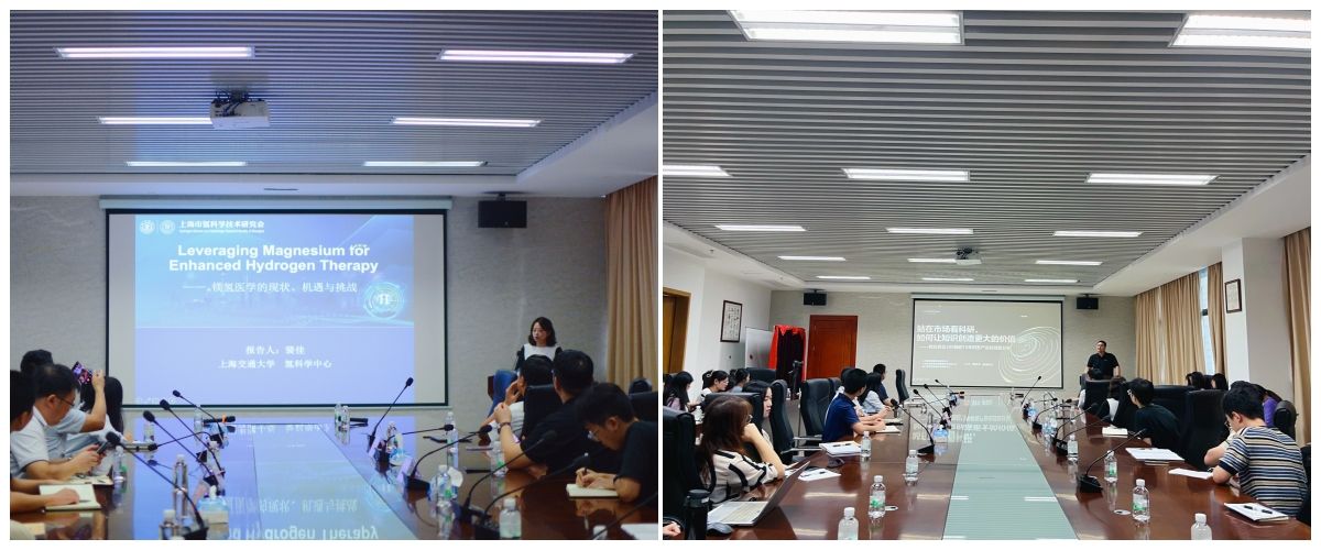 讲座期间,丁之光博士对上海交通大学氢科学中心进行了介绍;上海交大材料科学与工程公司教授、国家优秀青年科学家基金获得者裴佳教授介绍了氢在生物与医药领域的科研和应用进展,并和现场的师生进行了探讨和交流;“每年轻”品牌创始人、生物与医药专业硕士校外导师周孝华则从市场角度分享了如何让科研创造更大的价值。