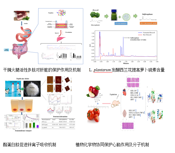 2. 功能性发酵食品与分子营养:采用发酵技术调控食品原料中功能性组分的合成与增量。利用代谢组学、空间组学等多维度方法挖掘发酵对原料微环境的影响作用。研究发酵食品中功能因子(活性肽、活性多糖、多酚等)在平衡膳食结构中的分子营养作用及其对机体健康影响的机制。